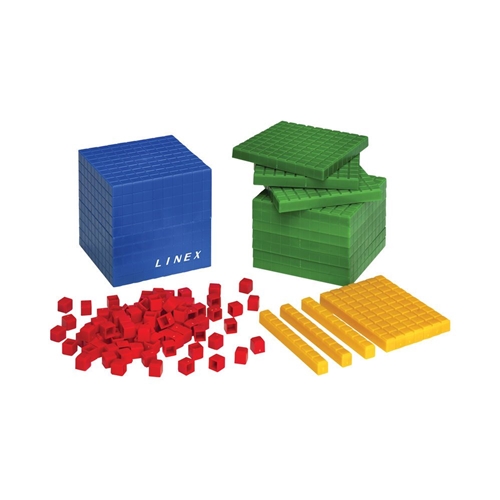 Enhance understanding of the decimal system as well as addition, subtraction, number sense, percentages and counting. Contains 121 parts. 1 blue thousand cube, 10 green hundred flats, 10 yellow ten rods, 100 red units. For use in pre-school and primary school.
