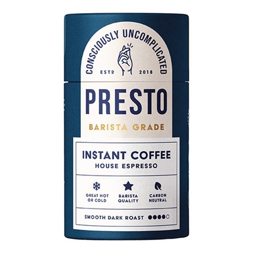 Presto Coffee has been roasting coffee for the last four years and is one of the market leaders in sustainable roasting. From sourcing RFA beans from the best farms worldwide to cutting our emissions by 94% through Carbon capture, you can rest easy knowing Presto provides you with a super sustainable cup of coffee.We grew tired of the stale, tasteless Instant Coffee on the market, which lacked sustainability innovation, so we decided to change that. Injecting energy, taste, and sustainability credits, Presto is shaking up the instant category for the better and, more importantly, making a fresh and delicious barista-grade Instant.Meet our House Espresso, a coffee boasting delicious chocolatey, caramely and nutty flavours, bringing high street coffee to you in an instant.